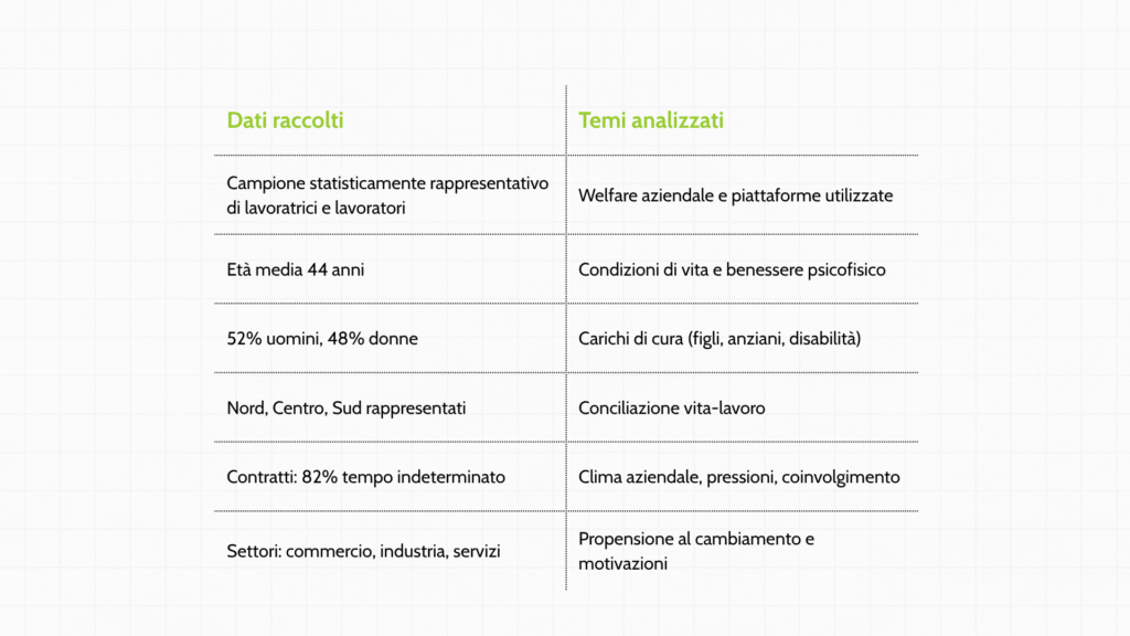 Realizzato da Welfare ComeTe in collaborazione con l’Università di Bologna (Dipartimento di Scienze Politiche e Sociali) e l’Istituto Ixé, questo studio ha coinvolto un campione rappresentativo di lavoratori in tutta Italia.